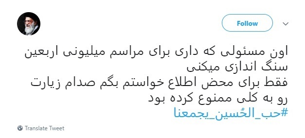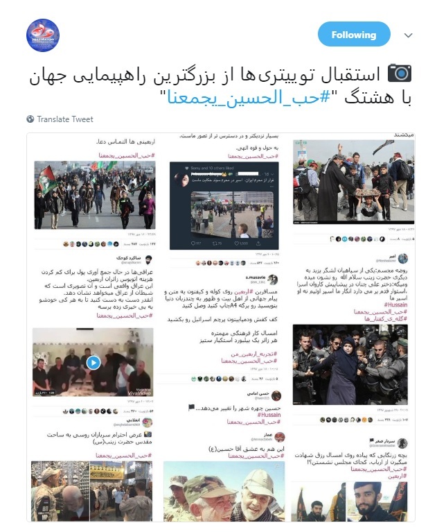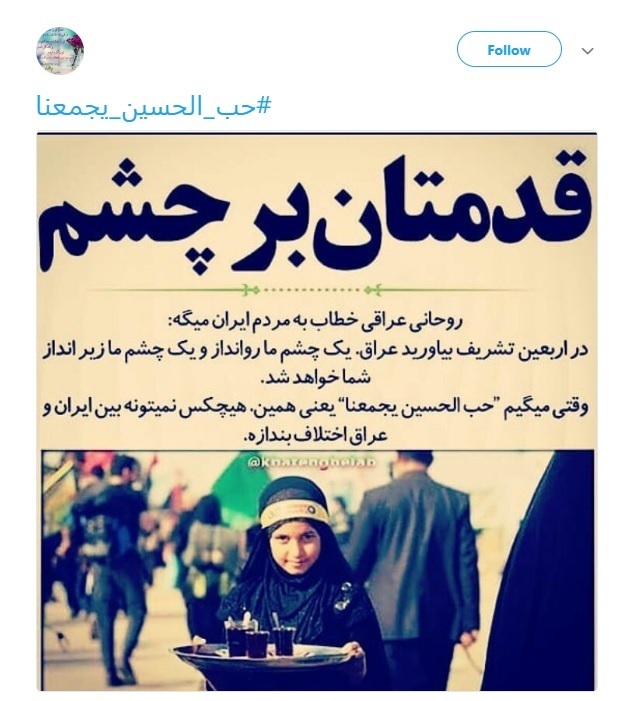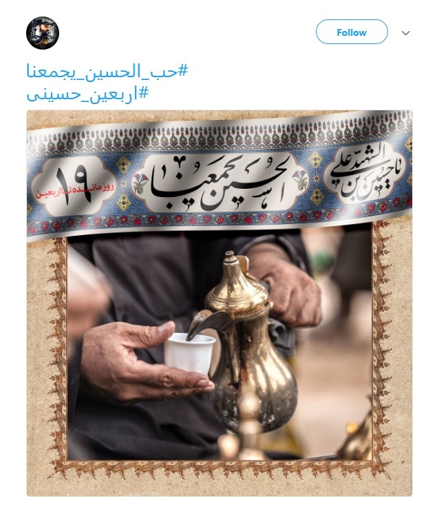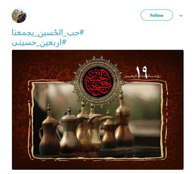 کاربران فضای مجازی در آستانه اربعین حسینی با هشتگ #حب_الحسین_یجمعنا ارادت خود را به سيدالشهدا(ع) ابراز کردند.