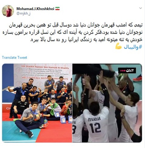 پس از قهرمانی مقتدرانه سروقامتان تیم ملی والیبال جوانان در رقابت‌های جهانی که با یک مربی ایرانی و در منامه بحرین رقم خورد، بسیاری از چهره‌های مشهور سیاسی و هنری و فعالان فضای مجازی با انتشار پست‌هایی این پیروزی بزرگ جوانان ایرانی را تبریک گفتند و از درخشش بازیکنان تیم ملی کشورشان در عرصه جهانی تشکر کردند.کاربران فضای مجازی معتقدند جوانان ایرانیِ با غیرت و پشتکار، با وجود کمبودهای مالی و پشتیبانی می‌توانند قدرت‌های بزرگ دنیا را با توکل به خدا شکست دهند.