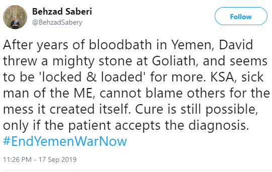 به گزارش سرویس بین الملل خبرگزاری صدا و سیما بهزاد صابری مشاور وزیر امور خارجه کشورمان امروز با ارسال پیامی در صفحه توئیتر خود، حمله یمنیها به تاسیسات نفتی سعودی را به پرتاب سنگ از سوی حضرت داود (ع) به جالوت تشبیه کرد و نوشت: پس از چندین سال حمام خون در یمن، داود یک سنگ نیرومند به سمت جالوت پرتاب کرد و به نظر میرسد که دست بر ماشه، آماده اقدامات بیشتر است. عربستان سعودی، مرد بیمار خاورمیانه، نمیتواند دیگران را به سبب افتضاحی که خود به راه انداخته است شماتت کند. درمان هنوز میسر است، اما فقط به شرطی که بیمار تجویز را بپذیرد. جنگ یمن را همین حالا پایان دهید.
