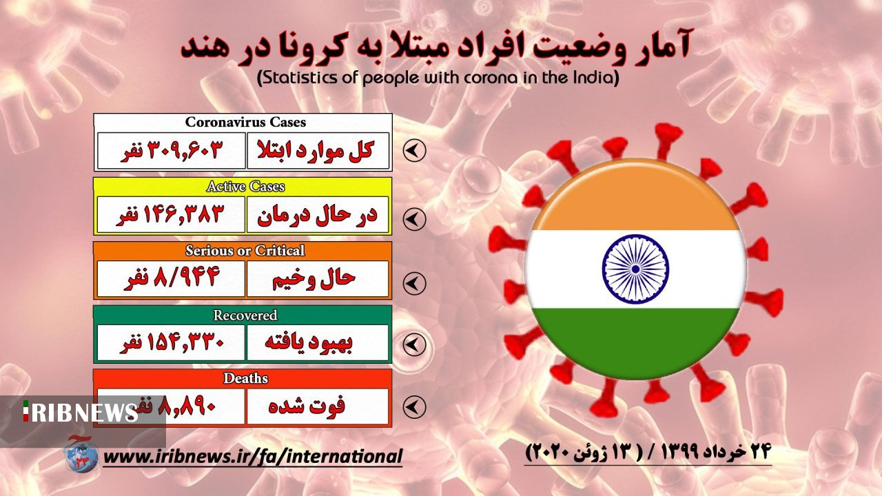 به گزارش خبرگزاری صدا و سیما از دهلی نو، تعداد کل مبتلایان به ویروس کرونا در هند به سیصد و هشت هزار و نهصد و نود و سه (۳۰۸۹۹۳) نفر رسید.