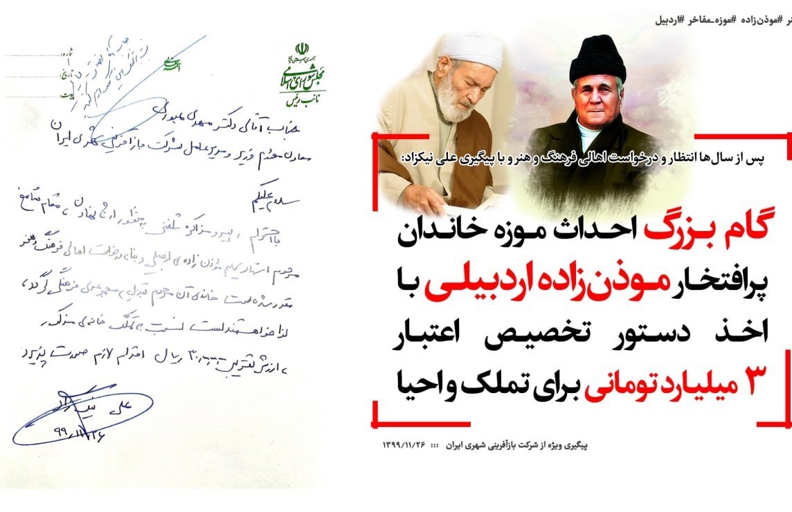 آقای نیکزاد، با بیان اینکه تملک، مرمت و احیای خانه موذنزاده اردبیلی از مطالبات اصلی نخبگان فرهنگی و هنری استان است، گفت: تملک این خانه و احیای آن با هدف احداث موزه این خاندان پرافتخار جزو انتظارات چند ساله همشهریان فرهنگ دوست اردبیل بود که دستور تخصیص اعتبار ۳ میلیارد تومانی برای تملک و احیای آن از معاون وزیر راه وشهرسازی و مدیر عامل شرکت باز آفرینی شهری ایران اخذ شد.
