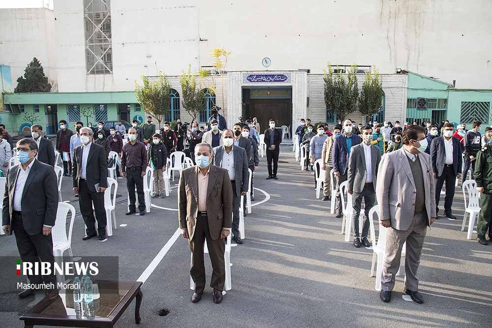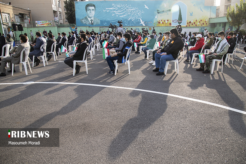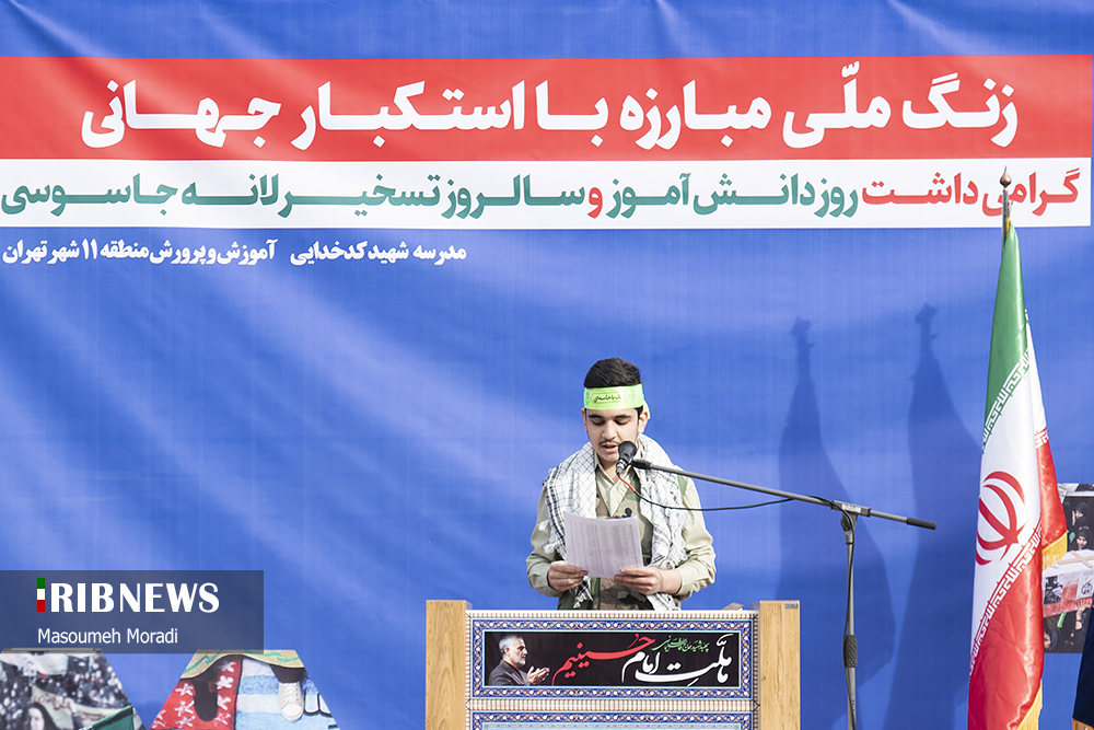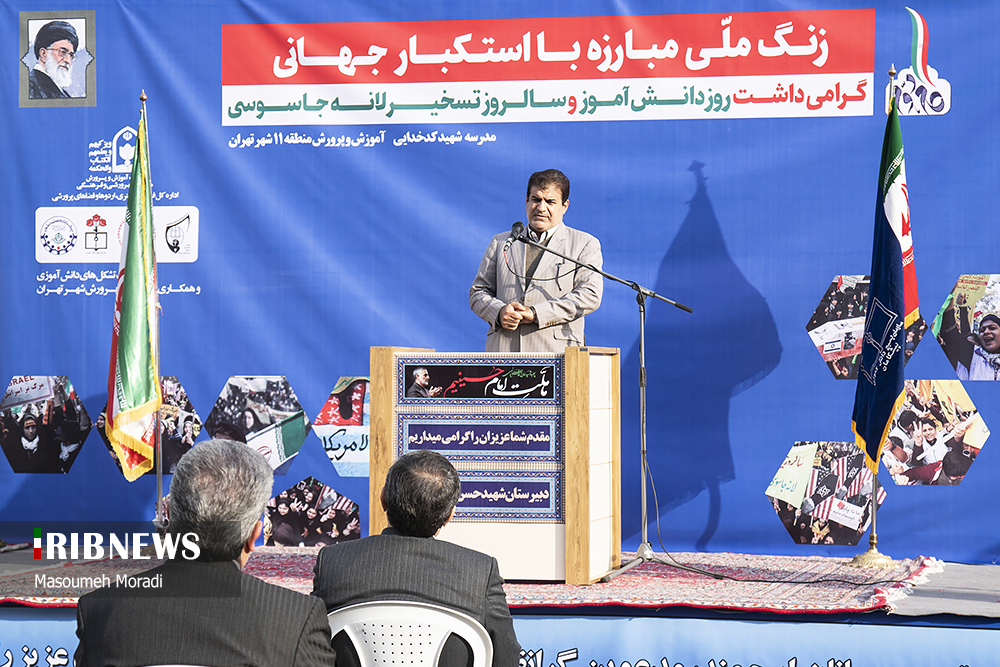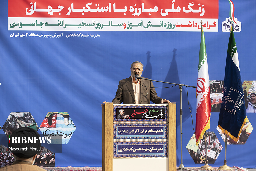 مراسم نمادین نواختن زنگ استکبارستیزی صبح امروز چهارشنبه ۱۲ آبان ماه با حضور آقای علیرضا کاظمی سرپرست وزارت آموزش و پرورش در دبیرستان پسرانه شهید کدخدایی منطقه ۱۱ تهران واقع در میدان پاستور برگزار شد