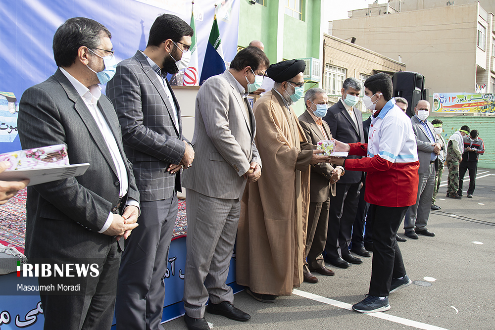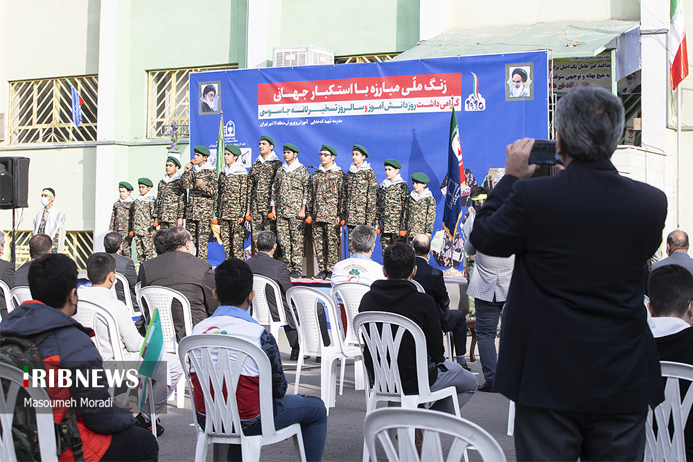 گروه عکس خبرگزاری صداوسیما؛ همزمان با این مراسم در ساعت هشت صبح زنگ استکبارستیزی در سراسر کشور نیز نواخته شد که این مراسم به صورت زنده در شبکه شاد پخش شد. بر اساس مصوبه هشتصد و پنجاه و چهارمین جلسه شورای عالی آموزش و پرورش، نواختن زنگ مناسبتهای ملی ـ اسلامی در مدارس کشور ساماندهی و مقرر شده است در طول سال تحصیلی فقط سه زنگ خاص به صورت همزمان در مدارس کشور در سه مناسبت آغاز سال تحصیلی، گرامیداشت دفاع مقدس (یکم مهر)، روز دانش آموز و استکبارستیزی (۱۳ آبان) و زنگ انقلاب اسلامی (۱۲ بهمن) نواخته شود. امسال به دلیل تقارن ۱۳ آبان با روز پنجشنبه و تعطیلی مدارس، زنگ استکبارستیزی در روز چهارشنبه ۱۲ آبان نواخته شد.
