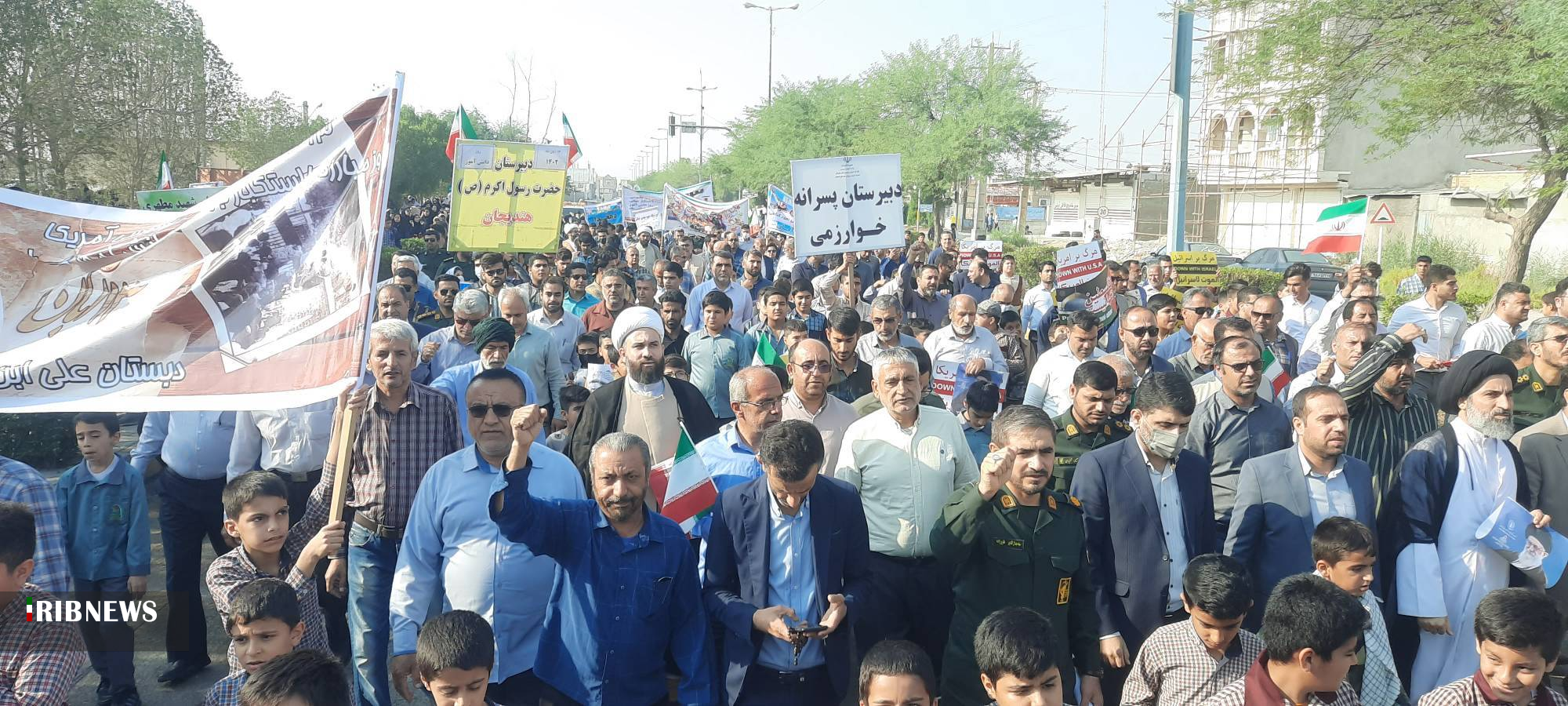 امروز و از ساعتهای اولیه صبح، مردم شهرهای مختلف استان خوزستان بار دیگر همبستگی و اتحاد خود را در دفاع از آرمانهای انقلاب و حفظ ایران اسلامی نشان دادند و با سر دادن شعار مرگ بر اسراییل و مرگ بر آمریکا انزجار خود را از «شیطان بزرگ» فریاد زدند.